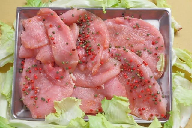 Truthahn mariniert mir rosa, grünen und weißen Pfefferkörnern zum Grillen.